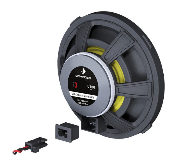 FlexMount is a mounting system based on specially developed adaptor rings, allowing the installation of COMPOSE FlexMount speakers in an almost infinite number of vehicles. Thus, the universal loudspeaker effortlessly becomes a vehicle-specific loudspeaker, that can be easily installed in the original installation position of the vehicle in an acoustically optimized way with the matching twist-lock FlexMount100 adaptor ring.