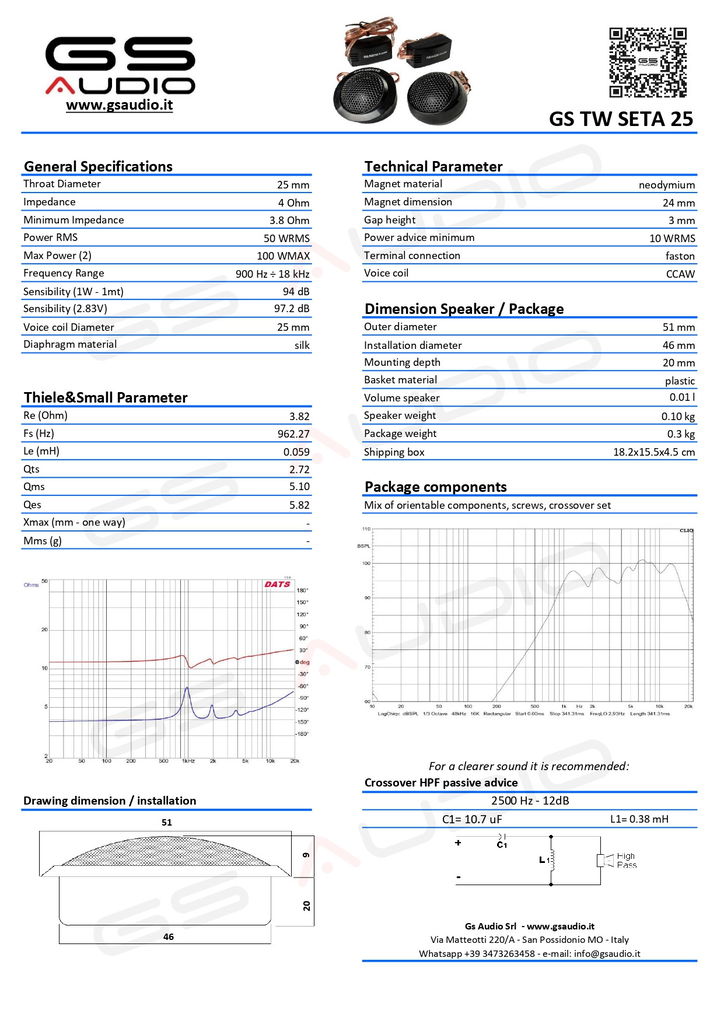 Gs Audio Tweeter Seta 25mm - 0.9/18kHz - 4 Ohm - with crossoverPrice refers to the entire kit, 2 tweeters and 2 crossovers50 WRMSThe Seta 25mm Tweeters provide crystal clear and detailed audio for your car audio system, making them an ideal choice for all systems in preparation.With extremely compact dimensions, they are designed for installation inside the doors in the car's original prearrangements and, thanks to the silk dome, are able to reproduce high frequencies with precision, adding clear definition to tunes. These Tweeters come complete with a crossover kit that optimizes frequency distribution between the speakers installed in your car. We recommend pairing these Tweeters with SQ 6 woofers to create a balanced 2-way kit.Also inside the box are: a mix of swivel components for tweeter installation, screws and crossover kit. Download here technical data sheet/Download here technical data sheet