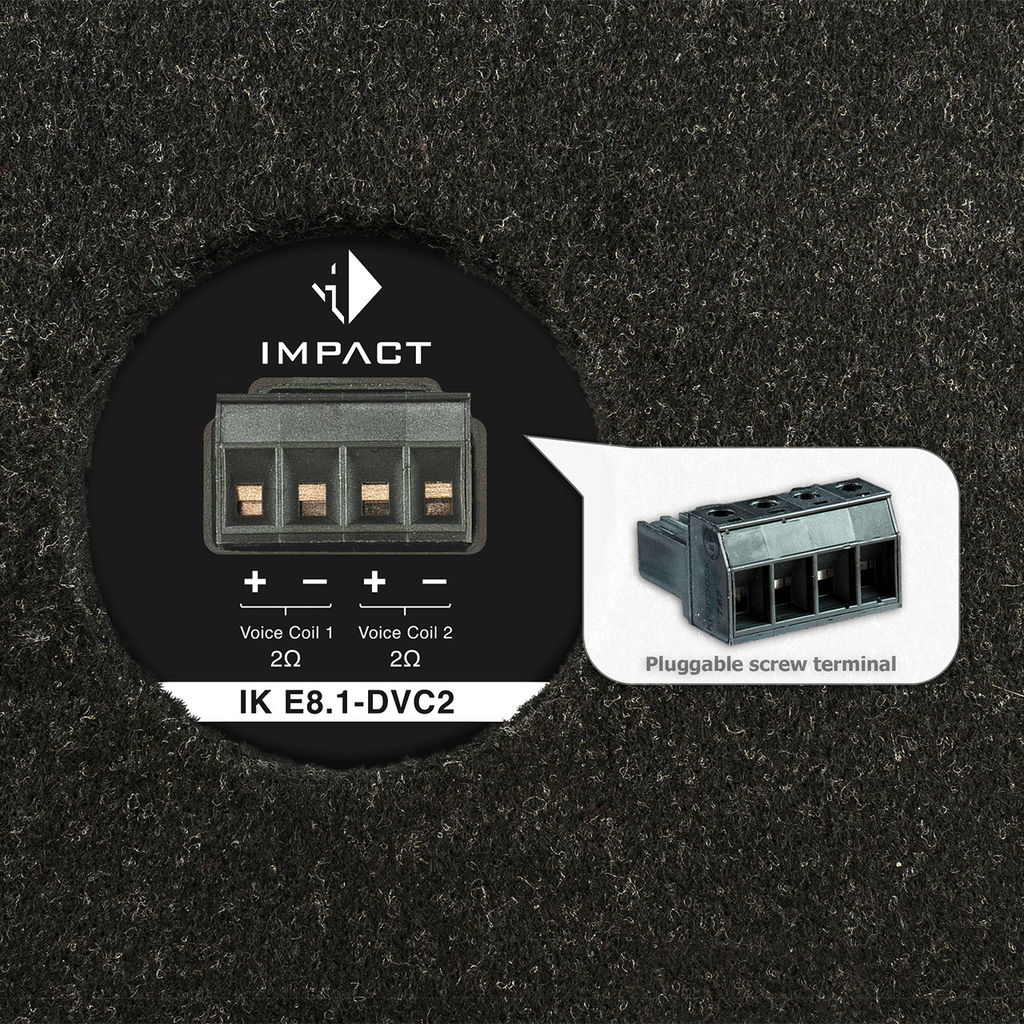 With the pluggable screw terminal, installation or removal of the subwoofer is fast and secure. With the option of a 1 x 2 Ohms (SVC2) or 2 x 2 Ohms (DVC2) configuration, there is a perfect deep bass specialist for every amplifier setup to maximize power output.
